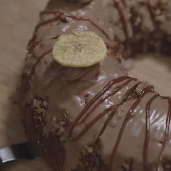Masa de brioche con agua de azahar, cítricos y ron, relleno de ganache montada de chocolate, cremoso de plátano y toffee.