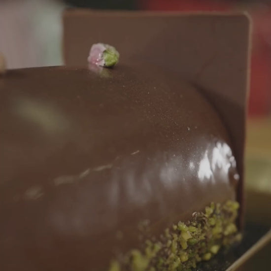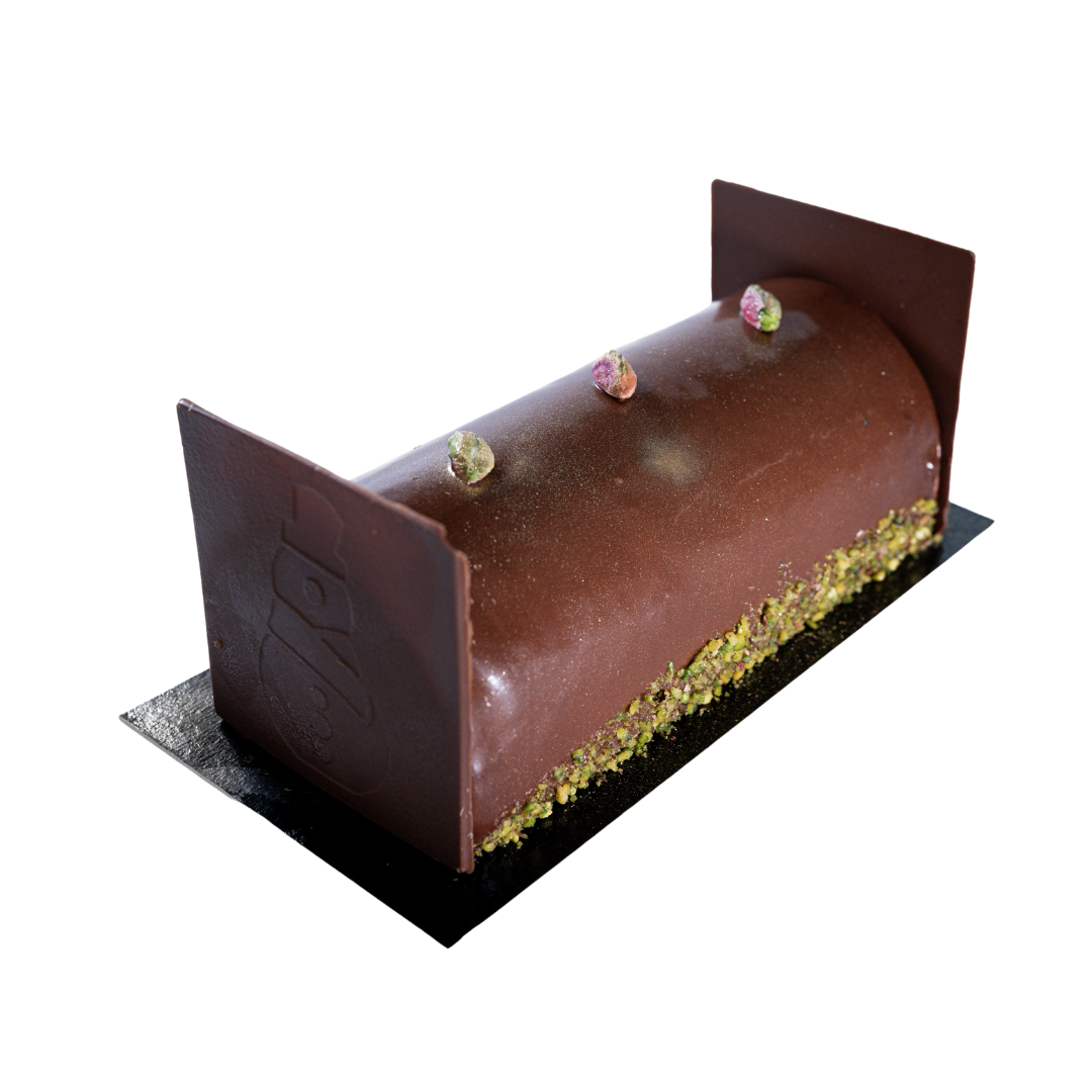 Bizcocho de pistacho, interior fluido de pistacho y kataifi con mousse ligera de chocolate con leche, bañado en chocolate.